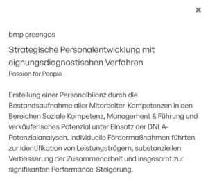 Unser Partner Passion for People und bmp Greengas haben sich in der Kategogie "Performance Management" um einen der HR-Excellence-Awards 2024 beworben und zwar mit der Anwendung der DNLA-Verfahren und der Personalbilanz. Mehr dazu hier: Top-Platzierung bei den HR Excellence Awards 2024 !